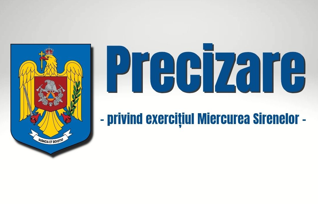 Inspectoratului General pentru Situații de Urgență anunță că în urma unei evaluări interne privind contextul actual de securitate și necesitatea unei informări publice mai ample, a fost decisă amânarea exercițiului de alarmare publică „Miercurea Sirenelor”.